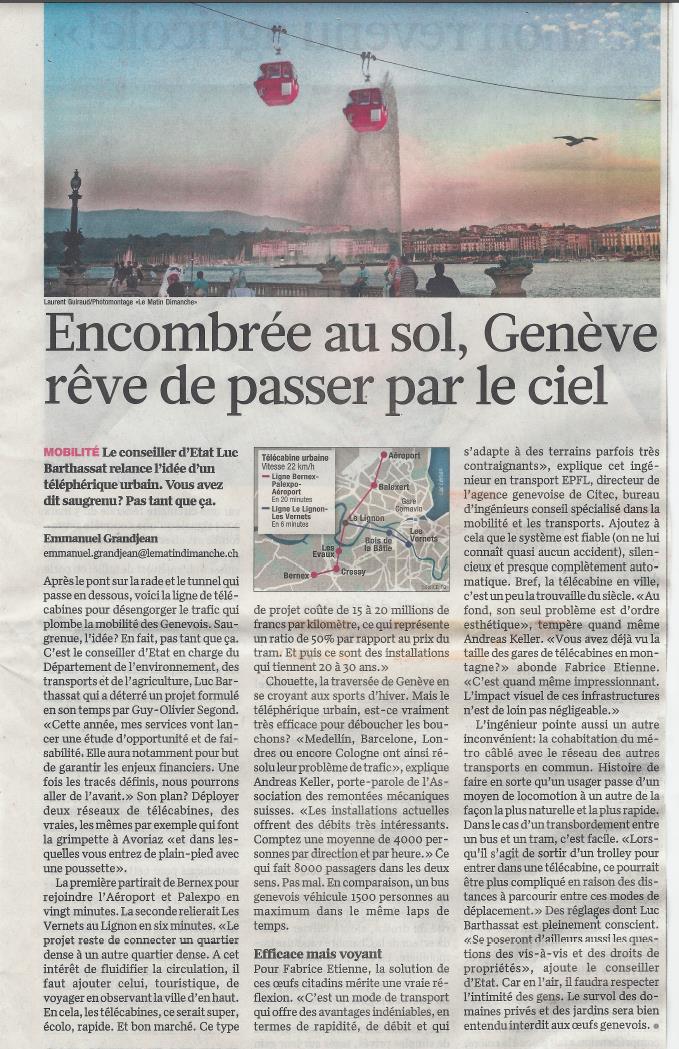 Citec, par son directeur de l’agence de Genève, Fabrice ETIENNE, a été interrogé sur la pertinence de développer un système de télécabines urbains dans le Matin Dimanche du 27 avril 2014.