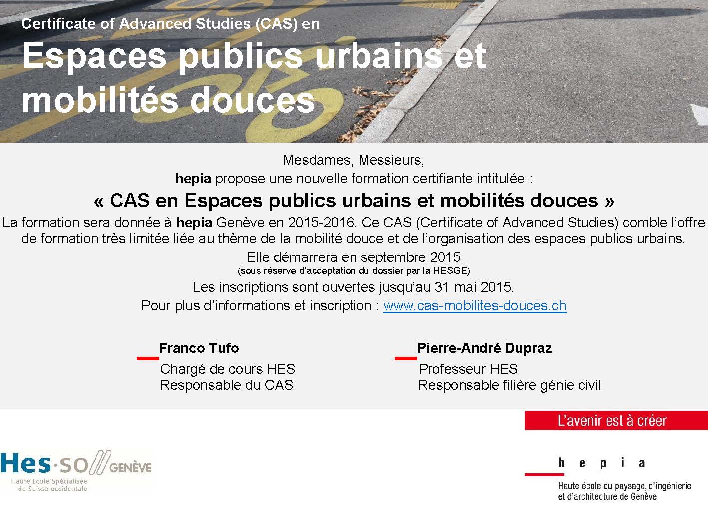 La Haute école du paysage, d’ingénierie et d’architecture de Genève (hepia) propose depuis cette année un CAS (Certificate of Advanced Studies) en « Espaces publics urbains et mobilités douces », dont Franco Tufo, directeur général de Citec, est responsable.