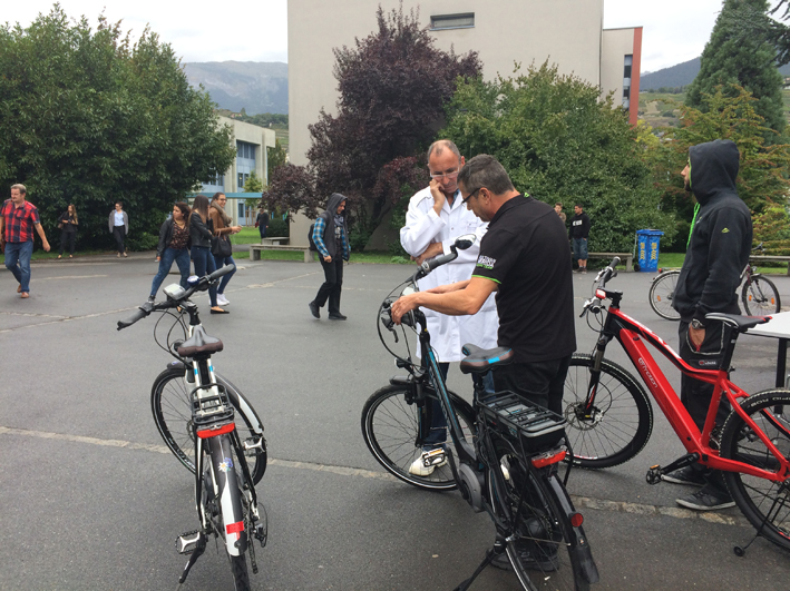 La première action concrète pour cette rentrée 2015 se concentre, en premier lieu, sur le vélo électrique. Parce que les partenaires du projet sont convaincus de ses atouts et parce que le vélo répond à un réel potentiel encore peu exploité aujourd’hui, il a été décidé de lancer des journées de tests et prêts gratuits de vélos électriques durant la semaine européenne de la mobilité (du 16 au 22 septembre 2015). La première a eu lieu aujourd’hui à l’EPCA où apprentis et collaborateurs avaient le choix d’essayer une dizaine de vélos électriques de toutes marques et de tous types. Les prochaines journées seront le 17 et le 21 à l’EPCA toujours puis le 22 au LCP. Il est également possible d’emprunter gratuitement un vélo électrique pour l’essayer sur son trajet domicile-école durant quelques jours.
