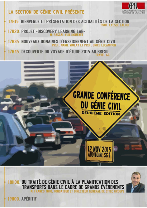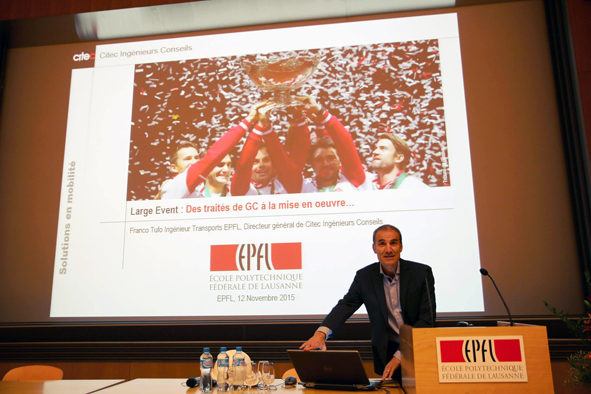 La Grande Conférence du Génie Civil de l’EPFL 2015, donnée hier par Franco Tufo, directeur général de Citec groupe, est une occasion de sensibiliser les futurs praticiens à la variété des missions qui leurs seront confiées. La présentation a évoqué les grandes lignes du montage d’un dossier de candidature, en présentant des cas concrets dans lesquels Citec est intervenu, tels que des Jeux Olympiques d’hiver, des phases finales de la FIFA World Cup, de l’Eurofoot ou du Tour de France.