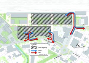 Ce principe permet de répondre globalement aux besoins du quartier en construisant seulement deux parkings totalisant environ 250 places, au lieu de 350 considérant les besoins de chaque surface indépendamment. Citec a également vérifié que la capacité des carrefours environnants pourra absorber ce trafic supplémentaire, et conseillé les architectes sur l’emplacement des trois accès aux parkings.