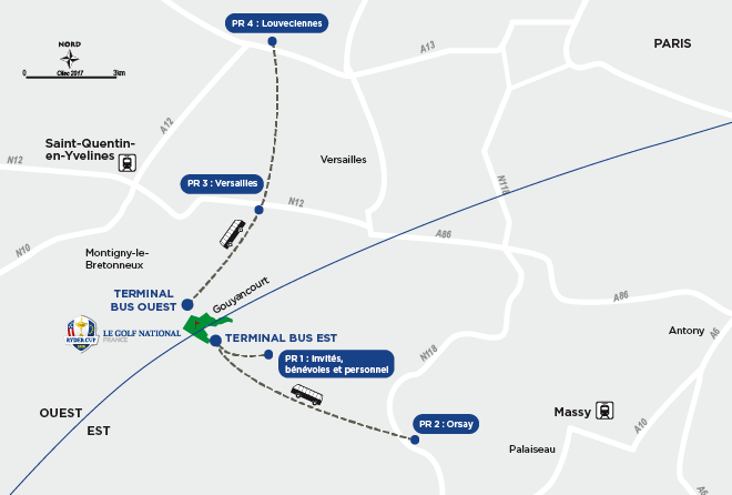 Afin d’éviter les stationnements sauvages et de fluidifier les accès autour du Golf National, les spectateurs accèdent aux sites par des navettes affrétées pour l’occasion. Aucun accès piéton ou autre n’est possible. Ces navettes partent des deux gares de Massy-Palaiseau et Saint-Quentin-en-Yvelines, ainsi que des quatre parcs relais situés à Toussus-le-Noble, Versailles-Satory, Louveciennes et Orsay. Le quartier de la gare de Saint-Quentin-en-Yvelines a été reconfiguré pour l’occasion afin d’assurer les déplacements de tous. La SNCF a donc mis en place des rames supplémentaires pendant les heures de pointes afin d’éviter tout encombrement avec les trains.