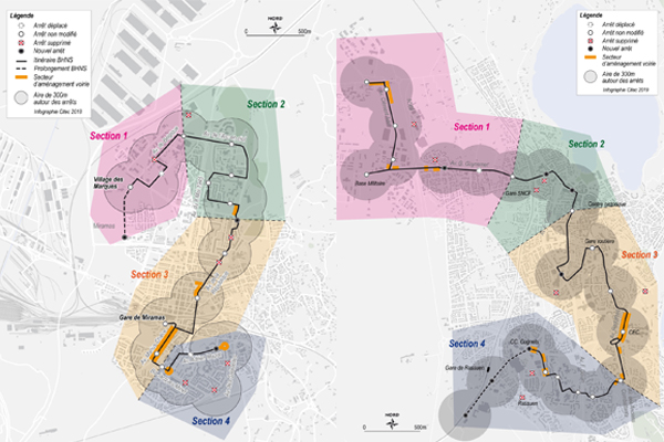 Variantes des itinéraires BHNS de Miramas et d’Istres (Crédit : infographie Citec)