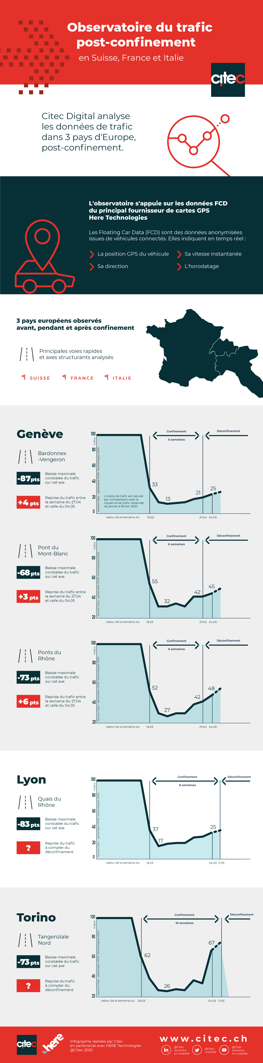 Alors que plusieurs pays d’Europe amorcent leur déconfinement, à quoi vont ressembler les grands axes de nos villes ? Citec s’associe au leader mondial de la cartographie numérique et des systèmes de navigation embarqués pour observer la reprise du trafic en Suisse, France et Italie. Cet observatoire sera actualisé chaque semaine pour suivre au plus près l’évolution du trafic post-confinement.