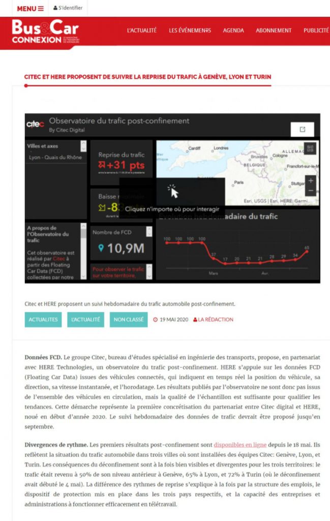 Bus&Car/Connexion, revue spécialisée dans le transport routier de voyageurs, le transport public et la mobilité, parle de l’Observatoire du trafic automobile post-confinement lancé par Citec, en partenariat avec HERE Technologies.
