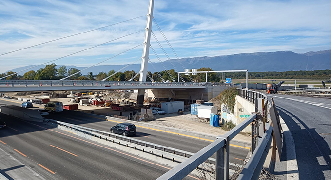 Autre étape de taille franchie dans la matinée du 15 octobre : celle de la mise en service partielle du passage supérieur de la jonction autoroutière du Grand-Saconnex (JAG). Ce nouvel ouvrage d’art, désormais ouvert à la circulation après deux ans et demi de chantier, constitue le tout premier pont à haubans du canton de Genève. Symbole fort de l’entrée de la ville, ce pont de 80 mètres de long, accueillant 3 voies de circulation dans chaque sens, se connectera au tunnel la route des Nations d’ici 2023.