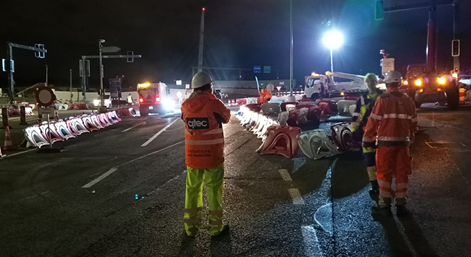 Une semaine de travaux de nuit a permis de réaliser un basculement de la position de l’ancien carrefour au débouché du nouvel ouvrage. Nos équipes étaient mobilisées pour accompagner et contrôler la succession des étapes de circulation nécessaires. Et tout particulièrement lors d’une étape coup de poing, qui, en maintenant un flux de circulation sur chaque PS, a permis le raccord du profil en long de la nouvelle infrastructure.