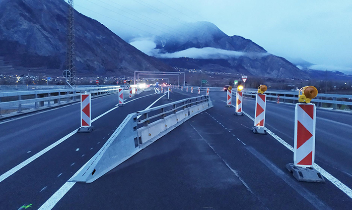 Jeudi 16 décembre 2021 en Valais, les poids lourds pouvaient de nouveau circuler sur le viaduc autoroutier de Riddes après deux ans d’interdiction et de longs mois de travaux d’assainissement. Le chantier de la jonction s’est divisé en six étapes sur la période de février 2021 à mars 2022. Lors des cinq premières phases du chantier, les bretelles autoroutières situées dans le périmètre du projet, ont tour à tour été fermées au trafic mais sont désormais toutes accessibles. Ces dix mois de travaux de sécurisation ont principalement consisté en la pose d’une nouvelle couche de béton fibré haute performance (CFUP), permettant ainsi la réouverture du pont aux poids lourds. La sixième et dernière étape de ce projet a également débuté le 16 décembre 2021 et vise à mettre en place la signalisation verticale, la signalisation lumineuse définitive et à réaliser des travaux de finitions tels que les îlots.
