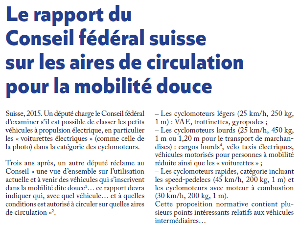 Un article paru dans la revue Transports Urbains, de Francisco Luciano, directeur Citec Paris, sur les conclusions du Conseil fédéral relatives aux véhicules intermédiaires et à leurs aires de circulation.