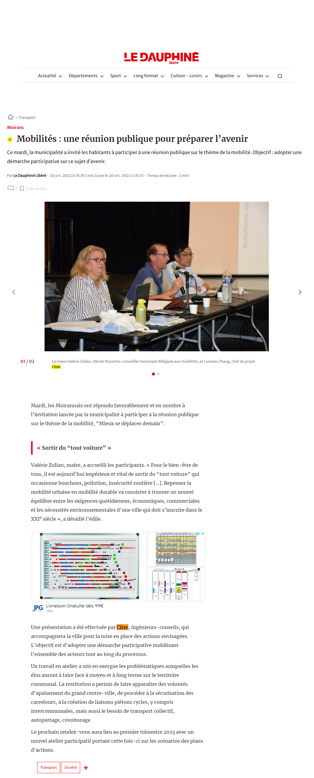 Mardi 18 octobre, les Moirannais ont répondu favorablement et en nombre à l’invitation lancée par la municipalité à participer à la réunion publique sur le thème « Mieux se déplacer demain ». Une présentation a été effectuée par Citec qui accompagnera la ville pour la mise en place des actions envisagées.