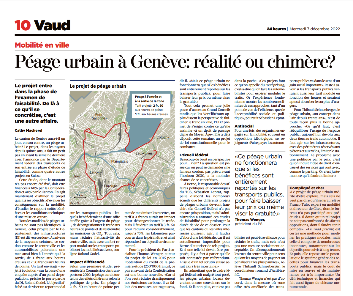 PRESSE – 24 Heures interroge Citec sur un péage urbain à Genève