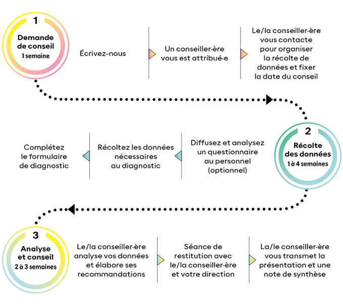 Le conseil se déroule en trois étapes (remplissage d’un questionnaire par l’entreprise, analyse des données par le conseiller et séance de restitution) dans un délai de trois à huit semaines.