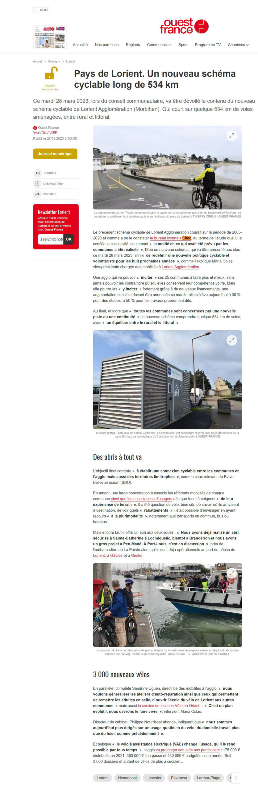 Le mardi 28 mars 2023, lors du conseil communautaire, le contenu du nouveau schéma cyclable de Lorient Agglomération (Morbihan) a été dévoilé. Réalisé par Citec, il court sur quelques 534 km de voies aménagées, entre rural et littoral…