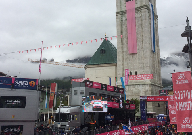 La sedicesima tappa del Giro d’Italia 2021 si è svolta lunedi 24 Maggio sotto una forte pioggia e temperature rigide. Queste condizioni metereologiche hanno costretto gli organizzatori a cambiare l’orario di partenza e ridurre la tappa a 153 km contro i 212 previsti all’inizio. Nonostante i cambiamenti dell’ultimo minuto questa tappa resta la più dura di questo Giro! Cortina si è mostrata pronta ad accogliere quest’evento forte dell’esperienza dei Mondiali di Sci Alpino organizzati a Febbraio 2021 e della pianificazione dei prossimi Giochi Olimpici Invernali del 2026. I nostri esperti Large Events erano presenti a fianco della municipalità.
